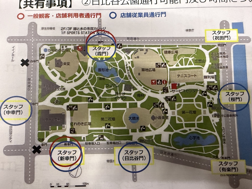 入園可能門「霞門」「新幸門」のみとなります。スタッフの方に「日比谷サローに行きたい」と、告げていただきますと通れます。13:30ごろまです❗️
